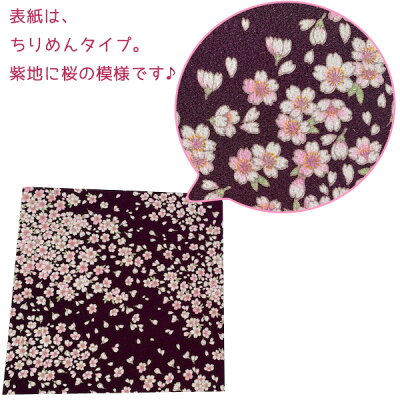 サイズ 大 (32cm角)・6切写真L版サイズ2枚と2Lサイズ1枚収納 表紙 ちりめんタイプ 紫地に桜の模様 素材 ポリエステルちりめん、(中枠:Vカット仕様) ハートのカラー 飛び出すハートはグリーンとピンクからお選び頂けます。